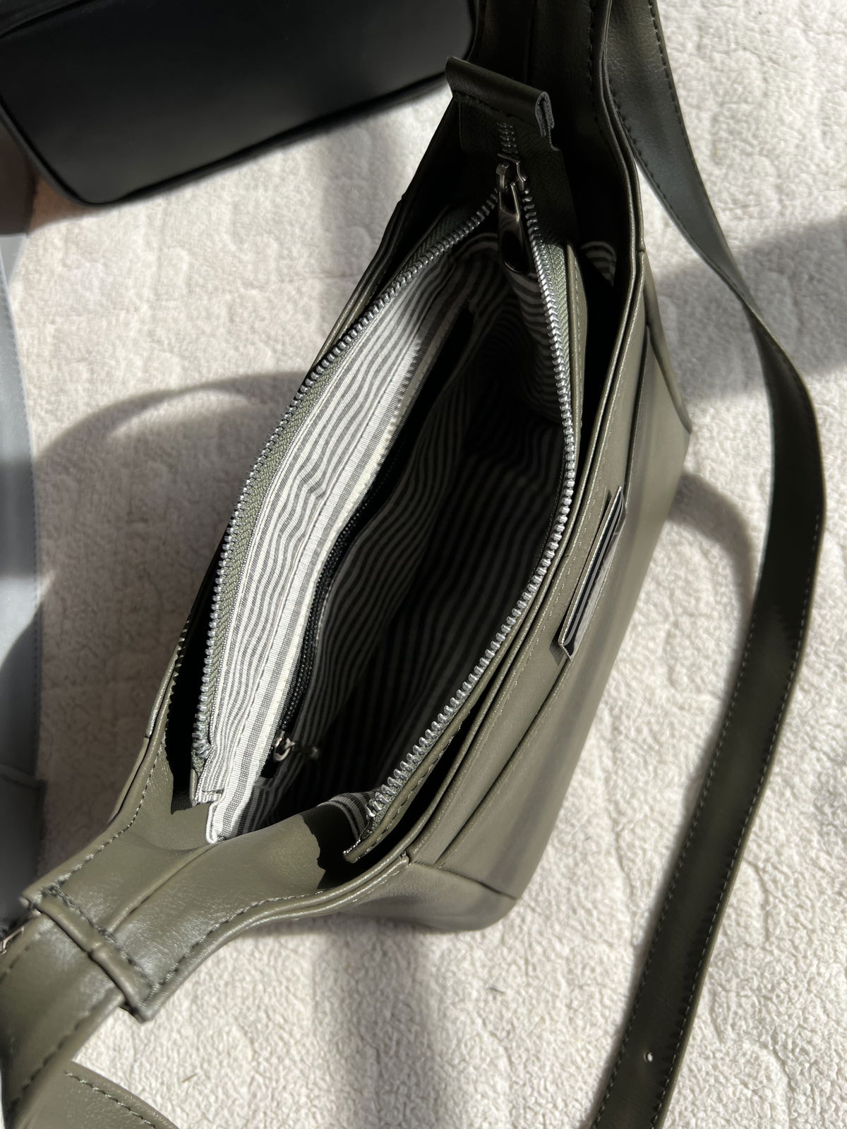 El interior, forrado en tela rayada, le aporta un toque de personalidad único, y los dos bolsillos laterales con cierre le dan ese toque de estilo que marca la diferencia.